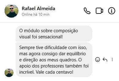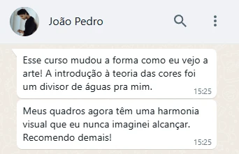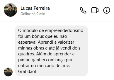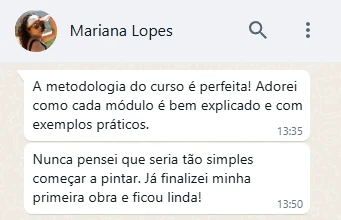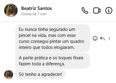 Com aulas práticas, projetos orientados e suporte contínuo, o curso oferece o que você precisa para avançar em cada etapa. Aprimore suas habilidades, transforme suas ideias em pinturas vibrantes e descubra como explorar todo o seu potencial artístico com confiança